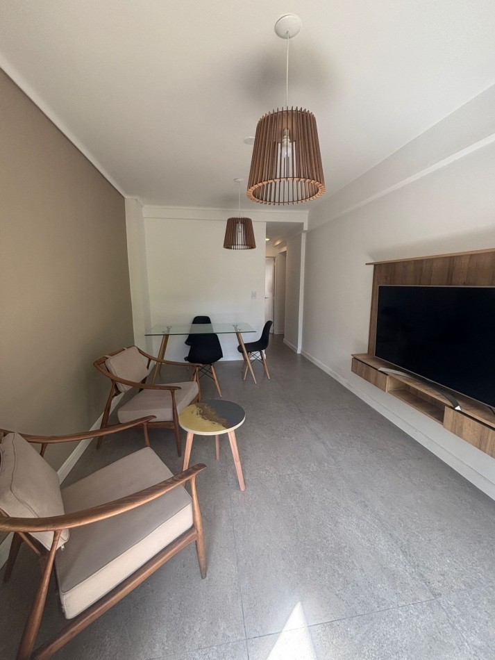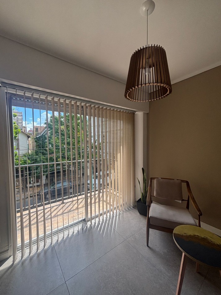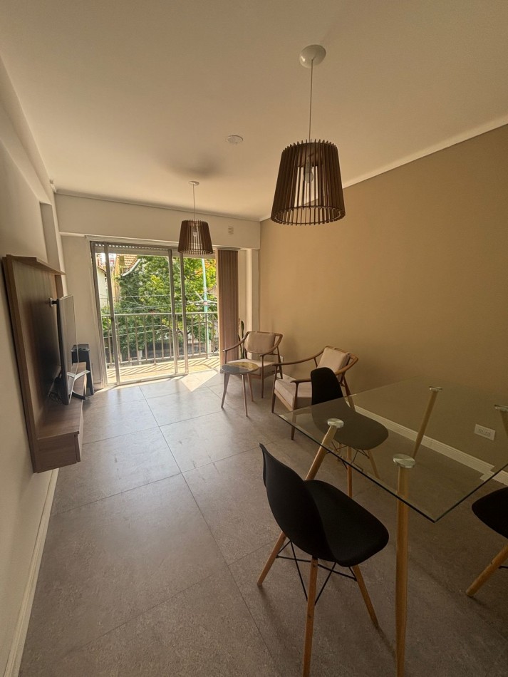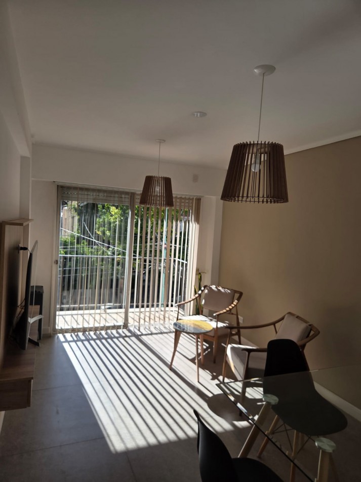 Living comedor al frente con balcón saliente, vereda de sol, super luminoso y ventilado. Incluye mesa y sillas, TV 55 pulgadas, calefactor tiro balanceado Coppens, mesa ratona, ventanal con persianas.