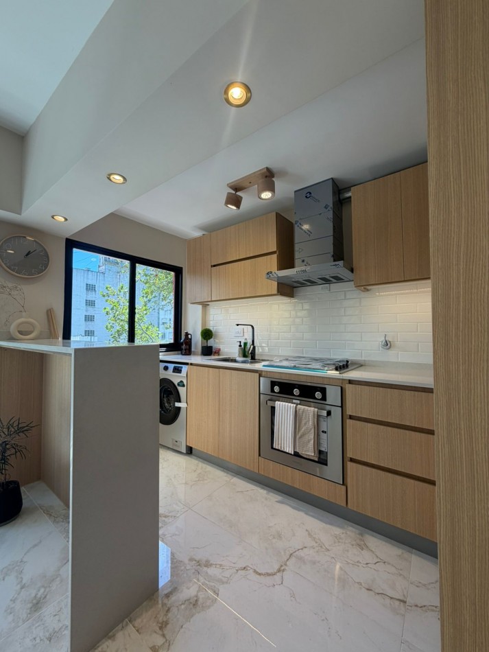 Cocina semi integrada, bajo mesada a medidas, horno empotrado, anafe y campana, heladera y lavarropas a estrenar.